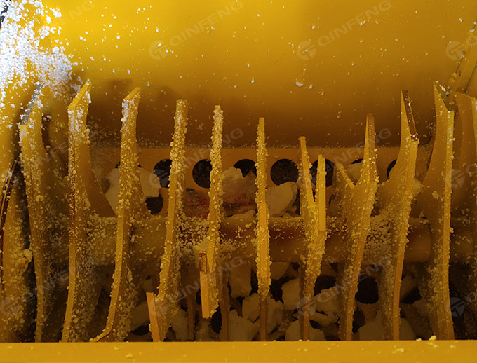 傾斜投料斗一便于投 EPS 物料,二物料不會(huì)在破碎過(guò)程中將物料推出料斗。發(fā)泡聚苯乙烯的熱熔回收 機(jī)用破碎刀,平行放置的刀軸,刀軸上對(duì)稱(chēng)地固定有刀片,刀軸上的刀片相互錯(cuò)位排列,并且每根 刀軸上的相鄰刀片以相同方向錯(cuò)開(kāi)一定角度排列于刀軸上。物料破碎后用電機(jī)帶螺桿壓出成塊。