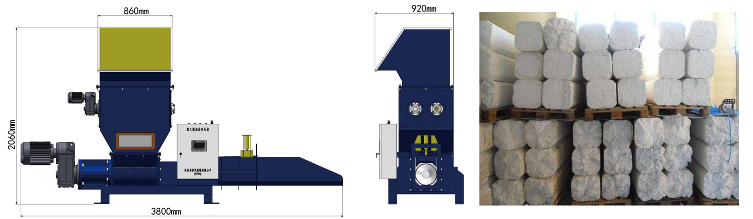 秦風機械的EPS泡沫冷壓機就是用來解決這個問題的,它可以減少EPS泡沫塑料材料的大小,壓縮比可以達到1:30-1: 50。壓縮的成品是EPS泡沫塑料塊,其密度可達250kg/m3,很容易把EPS泡沫塑料材料處理成另一種回收處理形態(tài)。